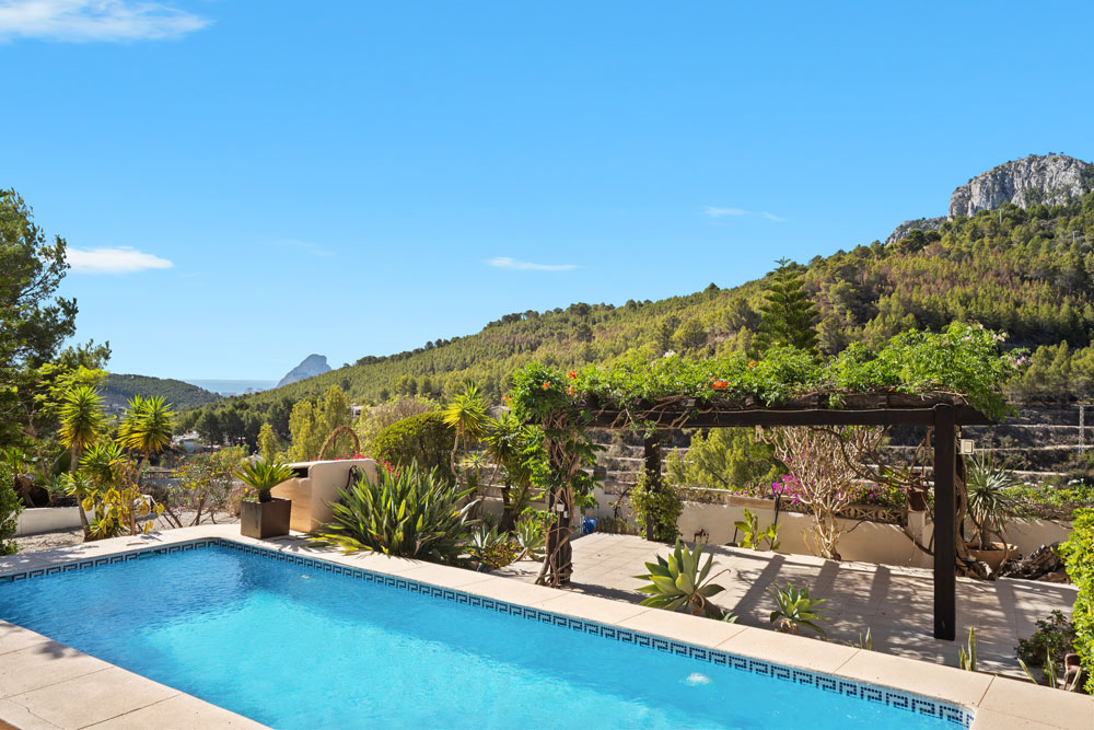 Bungalow for sale Benissa Calpe; This 120 m2 bungalow is uniquely located in a very rural yet very well-connected spot about 5 car minutes away from Calpe and a good 10 minutes from Benissa. he approach route from Benissa is beautiful and gives you the idea that you are in the middle of the beautiful Costa Blanca countryside. et is located near a picturesque hamlet with a chapel. Here you can still find some small-scale agricultural activity in the form of olive and grape cultivation, which completes the rural experience. et is a turnkey house with spacious living room, kitchen and 3 spacious bedrooms 2 bathrooms, garage and utility room. Behind the house is a 33m2 swimming pool with spacious garden, bordering the forest, guaranteeing privacy.