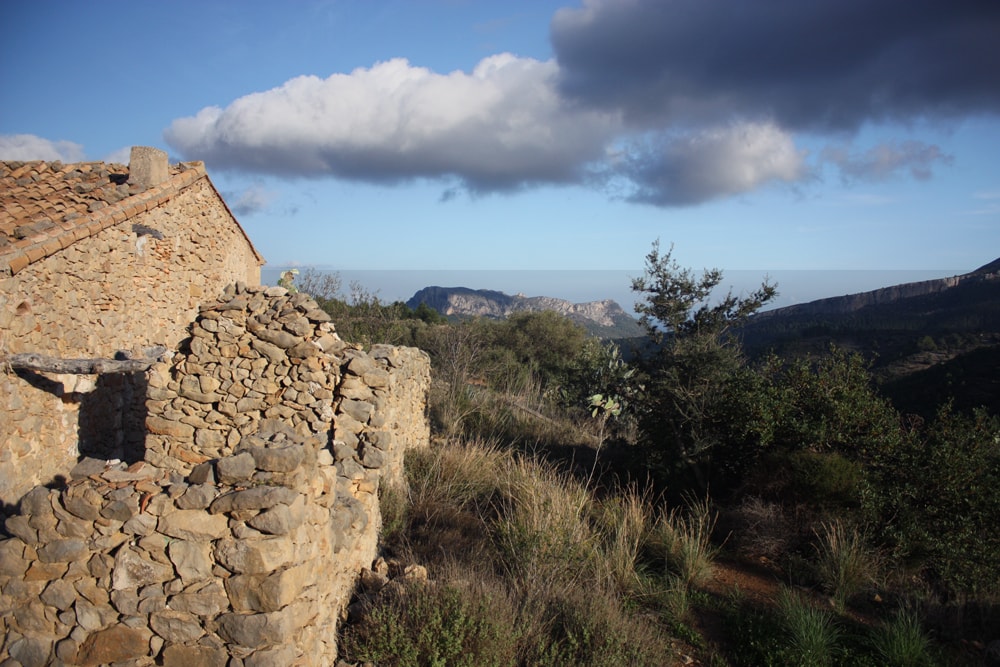 Buying a farm in Valencia: This truly fantastic and idyllic 300 year old farmhouse in ruins lies like an eagle's nest high above all human activity. Close to the Costa Blanca (25 minutes by car) and within the municipal boundaries of Jalon or Xalo Here you can still experience what total tranquillity is, you literally only hear nature here. The Finca is flanked on the right side by the Sierra de Bernia, and at the back protected by a ridge and is so sheltered. But to the front the house has an enormous panoramic view over the mountains up to the deep blue Mediterranean Sea. Who wouldn't want to wake up to such a view!